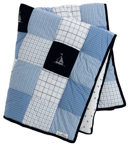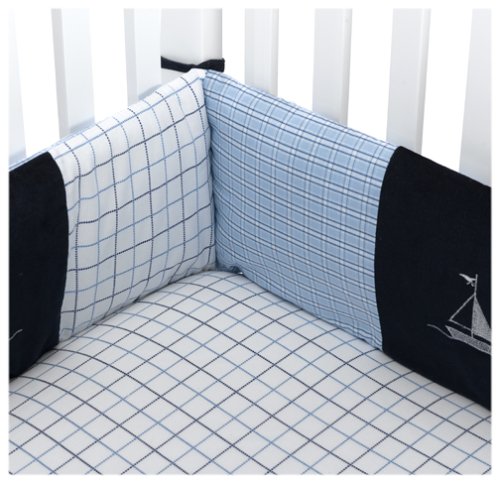 Buy Low Price From Here Now Ahoy, there, matey! The little sailor in your nursery deserves only the best. Although blue, this crib set shouldn’t be limited to boys; after all, who ever heard of a pink nautical theme? Comforter, crib sheet, bumper, and dust ruffle are all made of 100% cotton (with polyester filling in the comforter) and are machine washable, of course. A checkerboard pattern of various blue and white plaids is interspersed with a deep navy blue corduroy square featuring a trim little embroidered sailboat, and white squares with tiny blue sailboats. Nothing cutesy here—just a handsome crib set for a wee Old Salt with excellent taste. Coordinates with a full line of products for the nursery.
