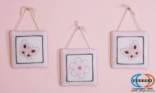 - 13-piece set includes: one comforter, one bumper, one fitted sheet, one skirt, two window valances, one diaper stacker, one toy bag and two throw pillows, three wall art decor hangings- Pink Butterfly Theme